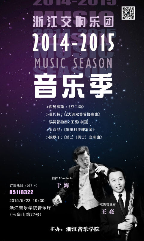 为进一步提高浙大学生的艺术素养,让同学们进一步近距离感受艺术的魅力,公共体育与艺术部现将举办第十四次艺术小旅行活动。本期旅行主题为:浙江交响乐团2014-2015音乐季 交响乐及双簧管专场。