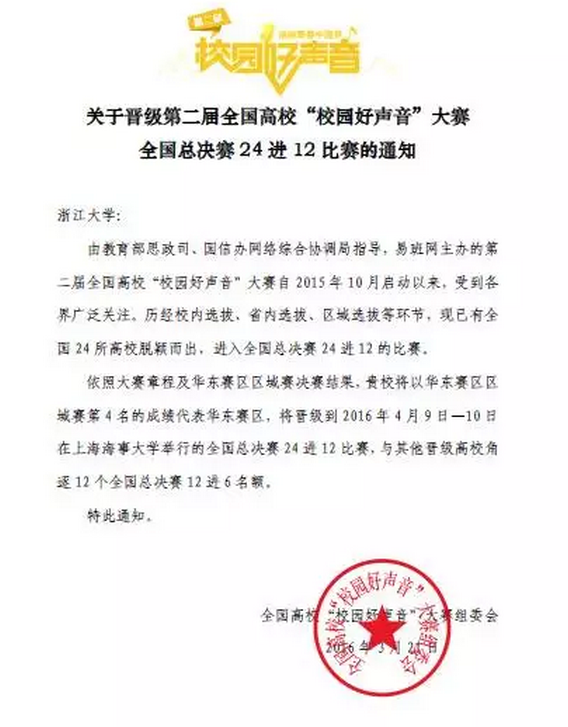 第二届全国高校“校园好声音”大赛,由中华人民共和国教育部思政司和国信办网络综合协调局联手举办,经过华南、华中、东北、西北、华东、华北、西南七大战区的巅峰对决及网络人气投票后,最终入围全国总决赛的24强席位已全部锁定。经过层层激烈角逐,浙江大学代表队有幸晋级全国24强。