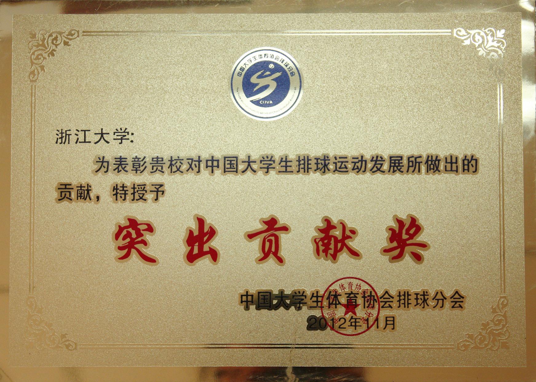 2012年11月24-27日,中国大学生体育协会排球分会第五届代表大会在云南•腾冲举行,来自清华大学、浙江大学、南京大学、复旦大学、北京航空航天大学、四川大学等全国78所高校、160余名理事成员出席此次会议。中国大学生体育协会排球分会为了鼓励先进,树立榜样,经中国大学生体育协会排球分会研究决定:对为中国大学生排球事业的发展做出贡献的先进单位予以表彰,浙江大学荣获中国大学生体育协会排球分会突出贡献奖。