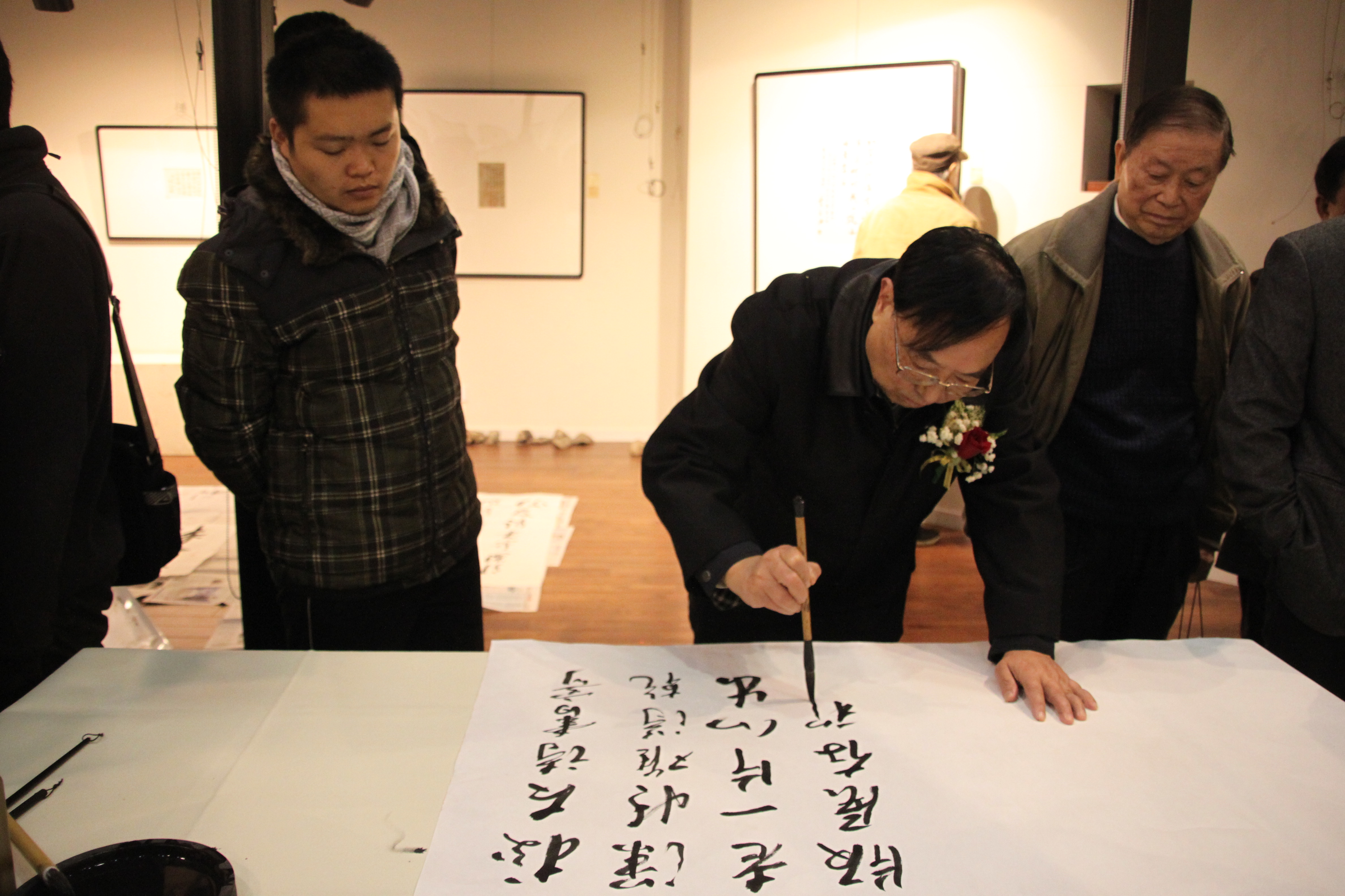 浙江大学书画社副社长、艺术系教授金晓明在开幕式上发言。他认为展览作品具有很高的文献价值,并非孤立的书法作品,还是浓缩的校史,体现了文人学者的艺术学识。张浚生、郭学焕、杨招棣、陈仲芳、丁茂鲁、杜高杰等在现场挥毫,留下了珍贵笔墨。参加笔会的还有浙江大学艺术系、书画社师生。