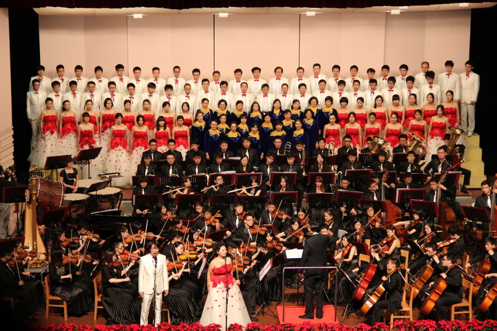 “大学之声”新年音乐会迄今已成功举办了6届,成为了每年跨年之际浙大师生的必备音乐盛宴。今年的新年音乐会格外的不同,交响乐团除了为大家献上传统曲目《鲁斯兰与柳德米拉序曲》、《胡桃夹子组曲》、《柴可夫斯基第五交响曲·第四乐章》、《威风堂堂进行曲》、《行星组曲·木星》等享誉世界的交响名曲,还特意编排了深受广大学生喜爱的电影配乐《幽灵公主》以及独具江南特色的清新小调《紫竹调》,使得整场音乐会独具“浙大特色”,赢得了在场观众的一片喝彩。同时,我校交响乐团还与文琴合唱团的同学们,爱乐乐团的热爱音乐艺术的老师们,以及工作在我校一线岗位上的教师合作了合唱《祖国颂》、《闲聊波尔卡》、二重唱《饮酒歌》、小提琴独奏《丰收渔歌》。