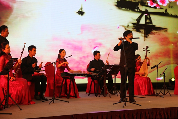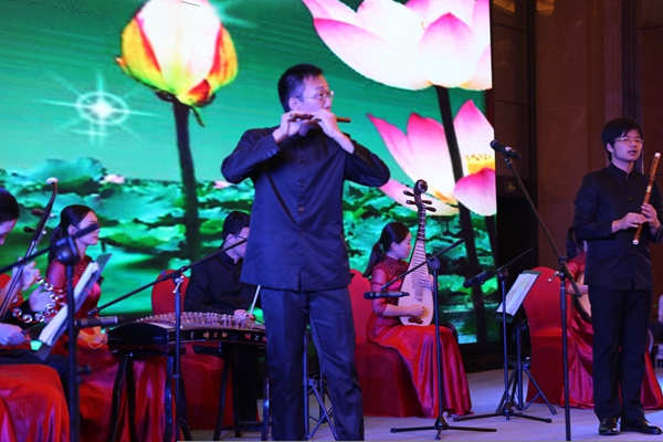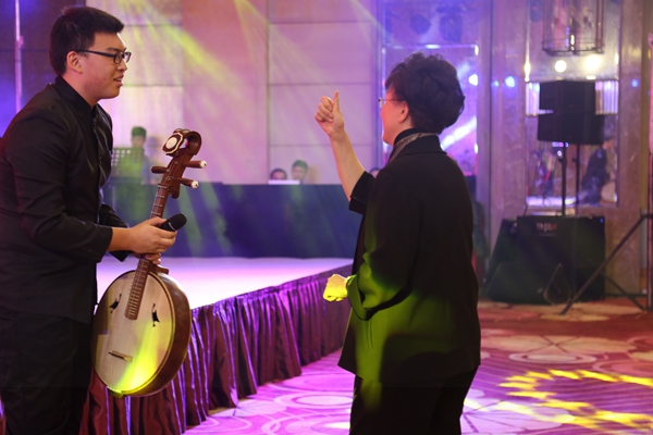 音乐会开始,一曲欢快奔放的二胡独奏《赛马》,拉开了文艺演出的序幕。无论是气宇轩昂的赛手,还是奔腾嘶鸣的骏马,都被二胡的旋律表现得惟妙惟肖;江南丝竹《紫竹调》旋律柔美流动,乐曲将浓厚的吴风民间曲调,委婉悠扬地传递给在场的每一位嘉宾;笛子独奏《扬鞭催马运粮忙》热情明快,以生动朴实的音乐语言,描绘出喜气洋洋的丰收情景;中阮独奏《云南回忆——第三乐章》将现场气氛推向了最高潮。此曲以幻想曲风结合云南少数民族曲调素材,将听众带入色彩丰富的迷人意境,令人耳不暇接。演奏者刘亦伦同学因现场演奏技艺精湛,情绪激昂,在弹奏高音区时,先后弹断了两根琴弦——“伯牙子期遇知音”。断弦后,他沉着冷静,继续在酣畅淋漓的琴声中结束了全曲的演奏,赢得了在场全体嘉宾长时间雷鸣般的掌声!整场文艺演出内容丰富,风格多样。最后一首《花好月圆》以悦耳欢快的旋律将听众带入了和美团圆、欢乐祥和的氛围之中。